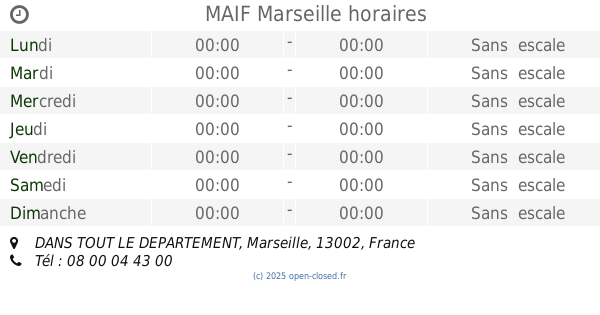 It is also possible to : Modifier ces HEURES D'OUVERTURE of Branche MAIF Dans Marseille, DANS TOUT LE DEPARTEMENT,